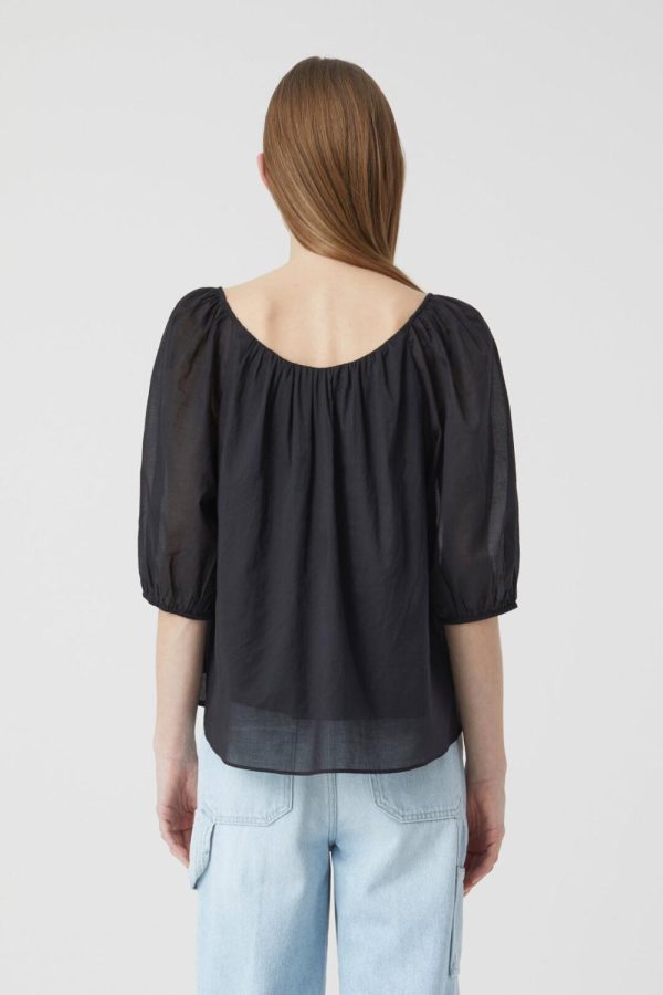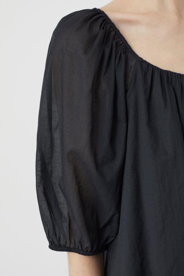 In A-Linie geschnittene Halbarmbluse aus sehr leichtem Baumwoll-Voile mit elastischen Ärmelabschlüssen und Futter aus Viskosestoff.
