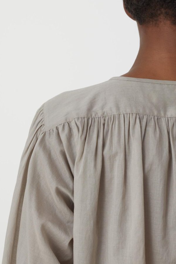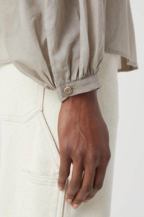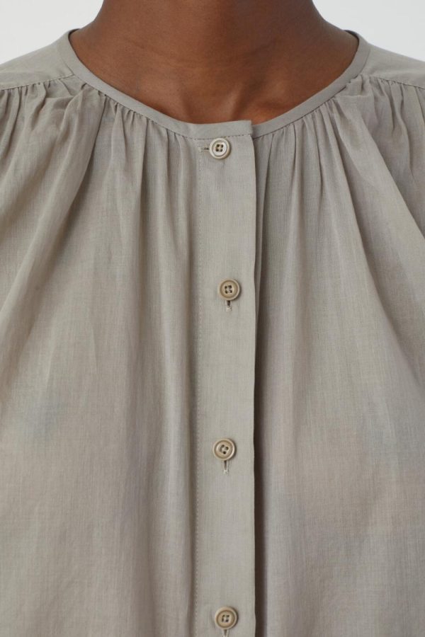Bluse im Relaxed Fit aus sehr leichtem Baumwoll-Voile in leicht transparenter Optik. Kragenlose A-Linie mit feinen Falten, voluminösen Ärmeln und durchgehender Knopfleiste mit tonigen Knöpfen.