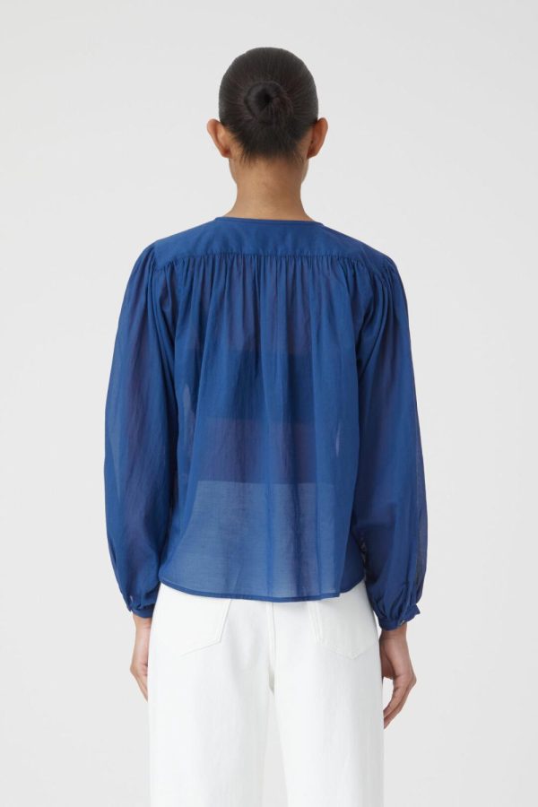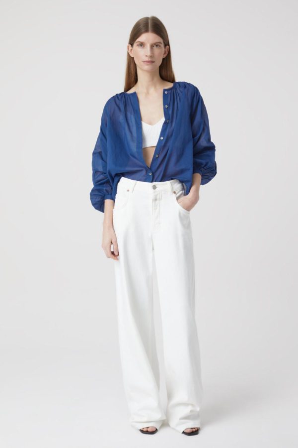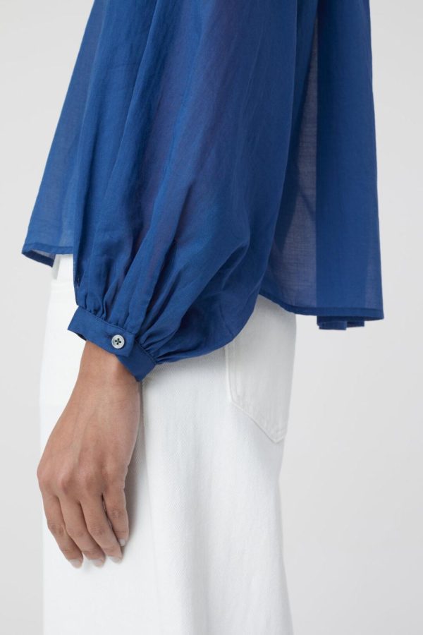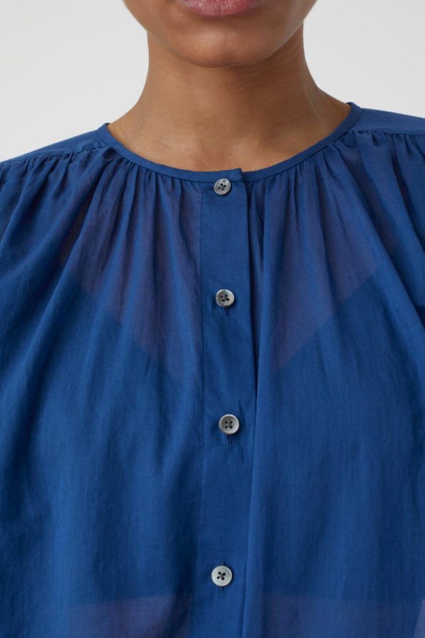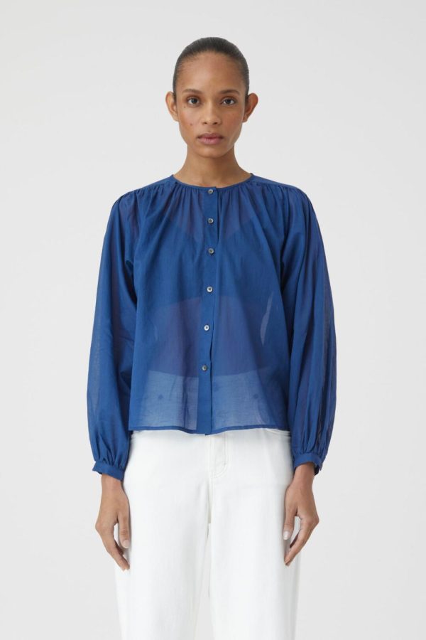 Bluse im Relaxed Fit aus sehr leichtem Baumwoll-Voile in leicht transparenter Optik. Kragenlose A-Linie mit feinen Falten, voluminösen Ärmeln und durchgehender Knopfleiste mit tonigen Knöpfen.