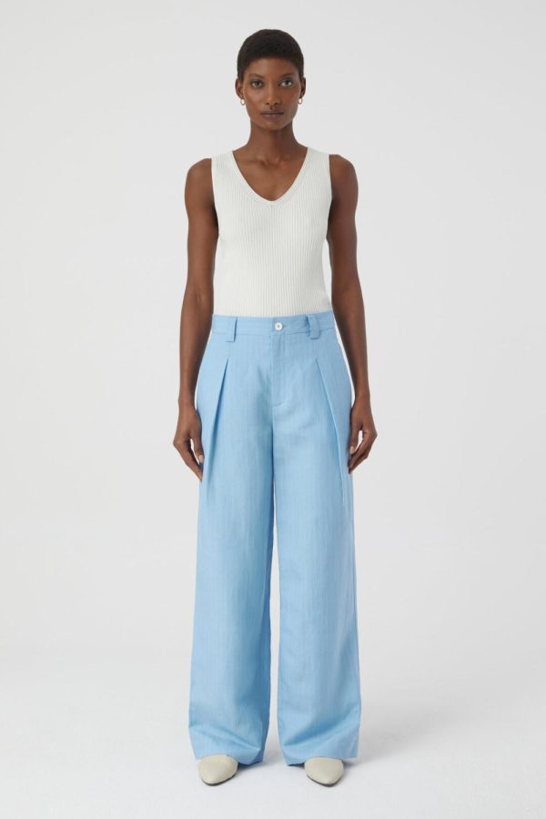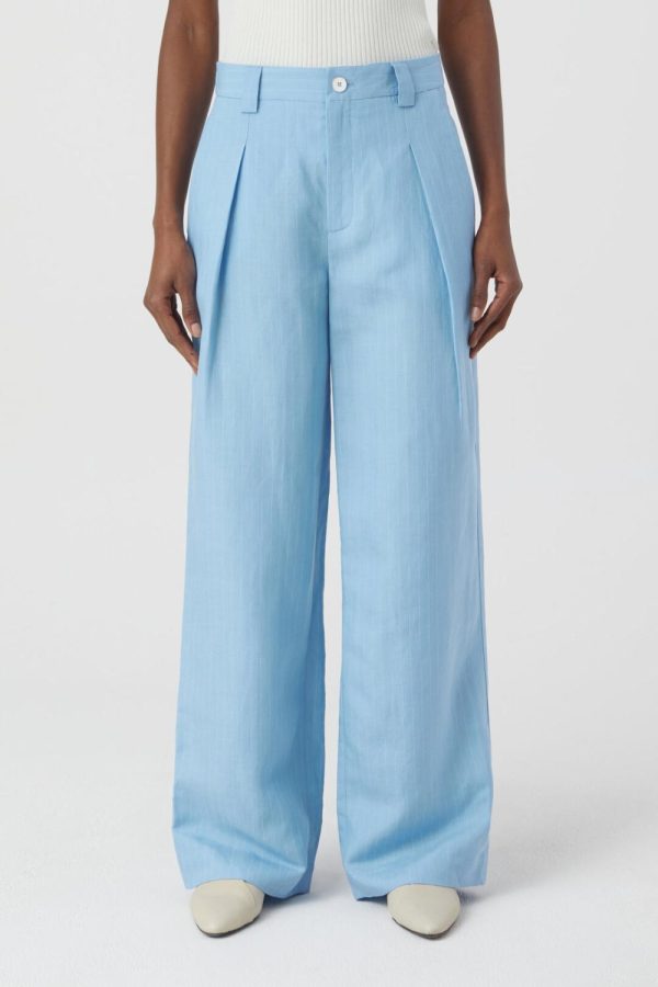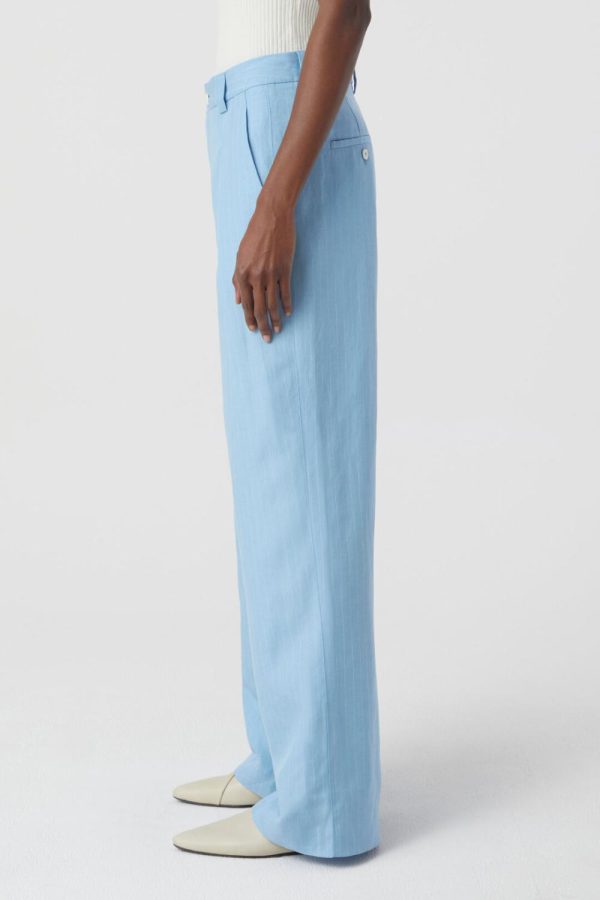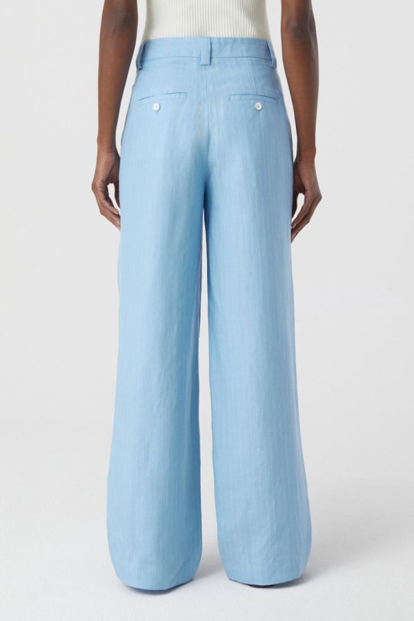 New Relaxed Fit Brooks mit Bundfalten, seitlichen Eingrifftaschen, Bundknopf und Zipper sowie mit geknöpften Taschen auf der Rückseite. Aus weich fallendem italienischem Leinen-Mix mit feinen eingewebten Streifen und lebendiger Struktur.