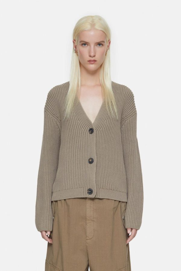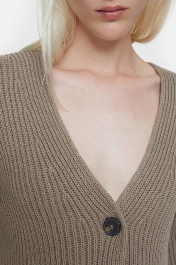 Gestrickt aus reiner Bio-Baumwolle: Der Cardigan im mittelschweren Fishermans‘ Rib (5 gg) hat einen V-Ausschnitt, überschnittene Schultern und einen kleinen V-Ausschnitt auf der Rückseite. Er ist relaxt geschnitten und mit Knöpfen in Horn-Optik ausgestattet.