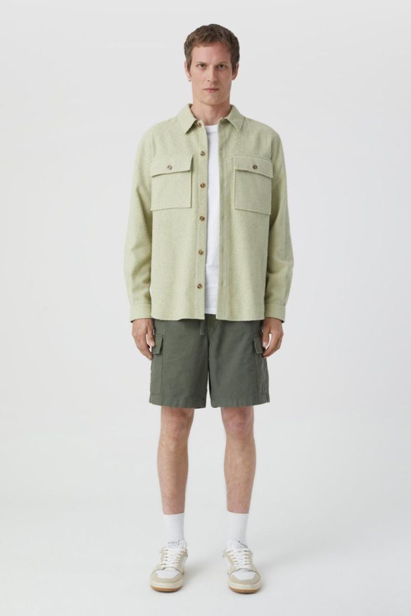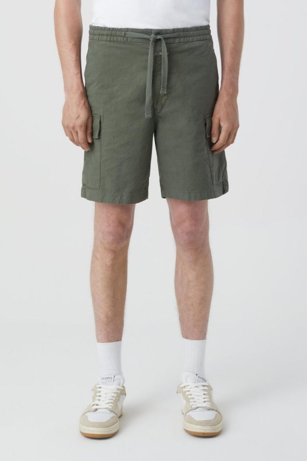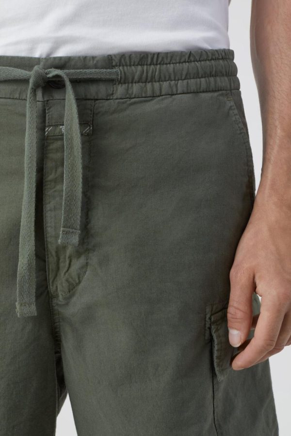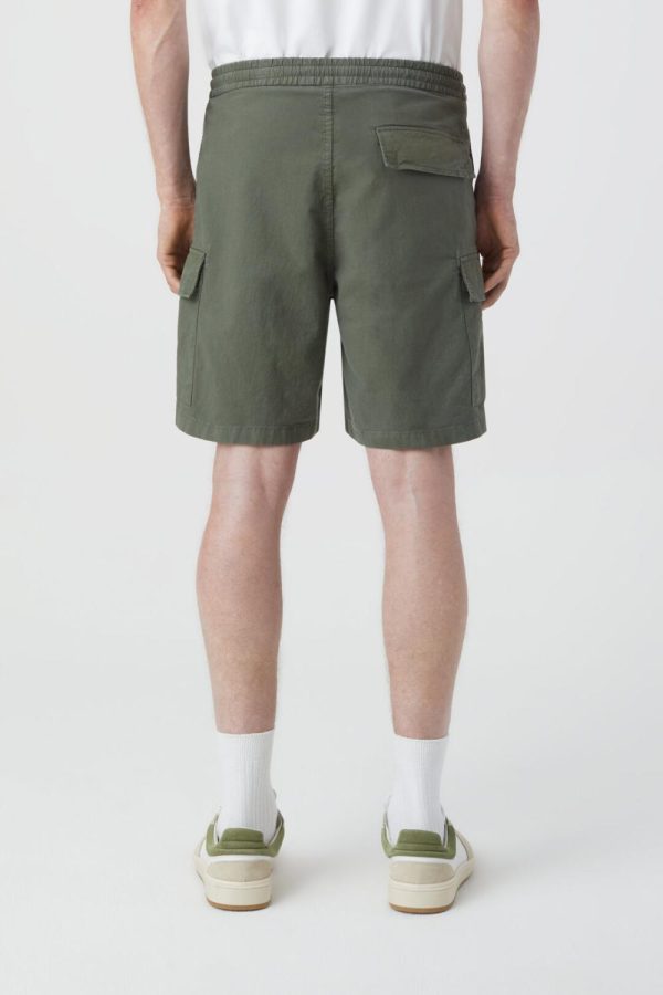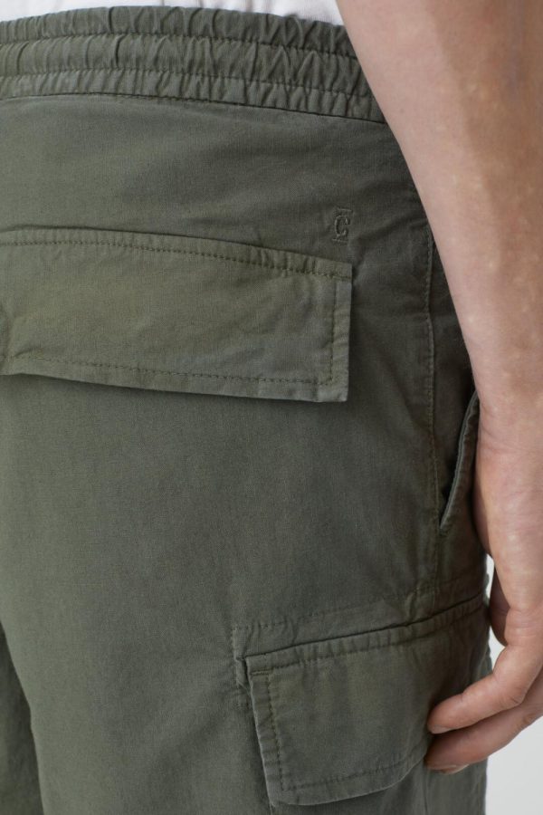 Cargo Shorts mit Stretchbund, Tunnelzug, Knopf und Zipper, seitlichen Eingrifftaschen sowie aufgesetzten Taschen an den Seiten. Gefertigt aus organic Cotton-Stretch mit lebendiger Struktur und Garment-dye-Finish.