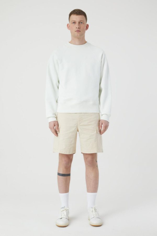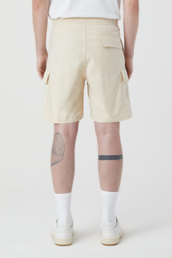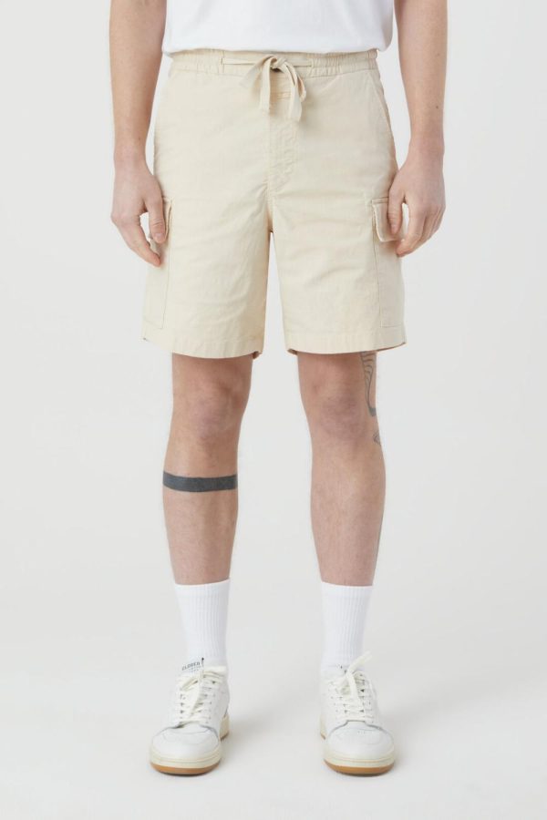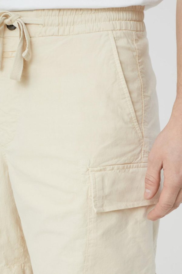 Cargo Shorts mit Stretchbund, Tunnelzug, Knopf und Zipper, seitlichen Eingrifftaschen sowie aufgesetzten Taschen an den Seiten. Gefertigt aus organic Cotton-Stretch mit lebendiger Struktur und Garment-dye-Finish.