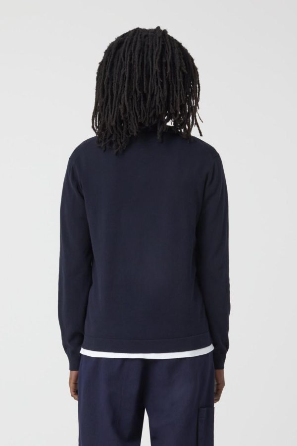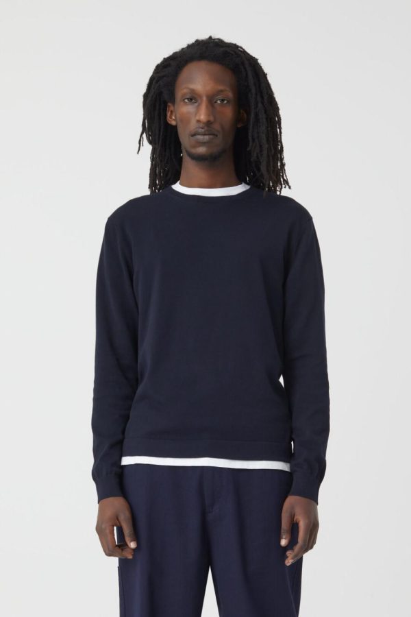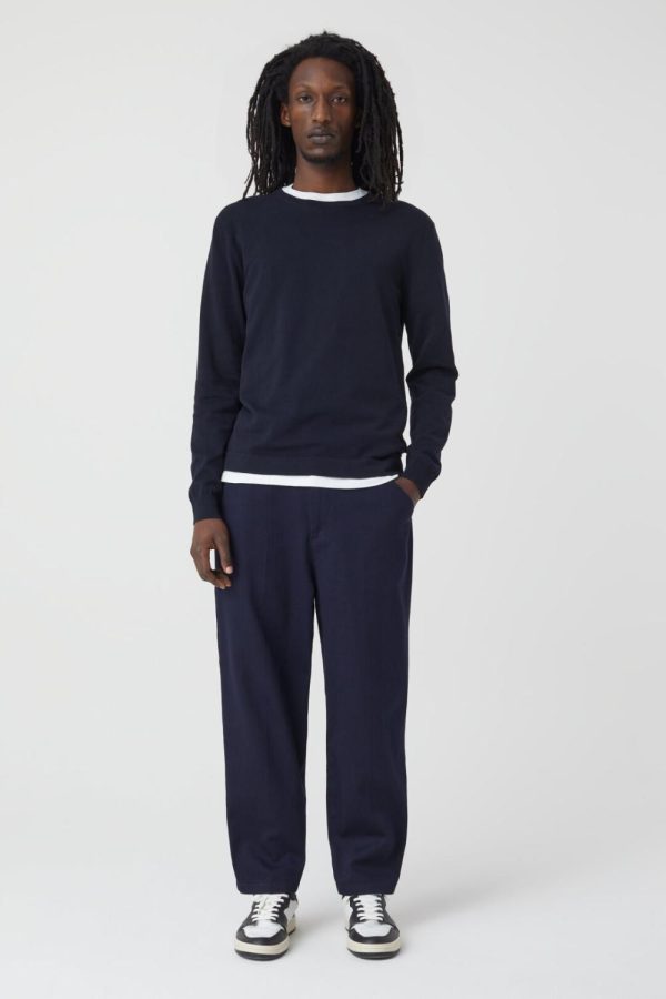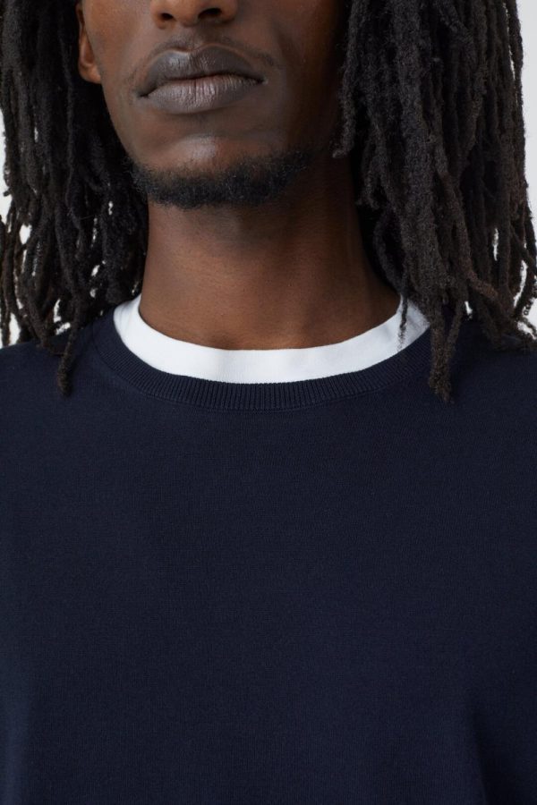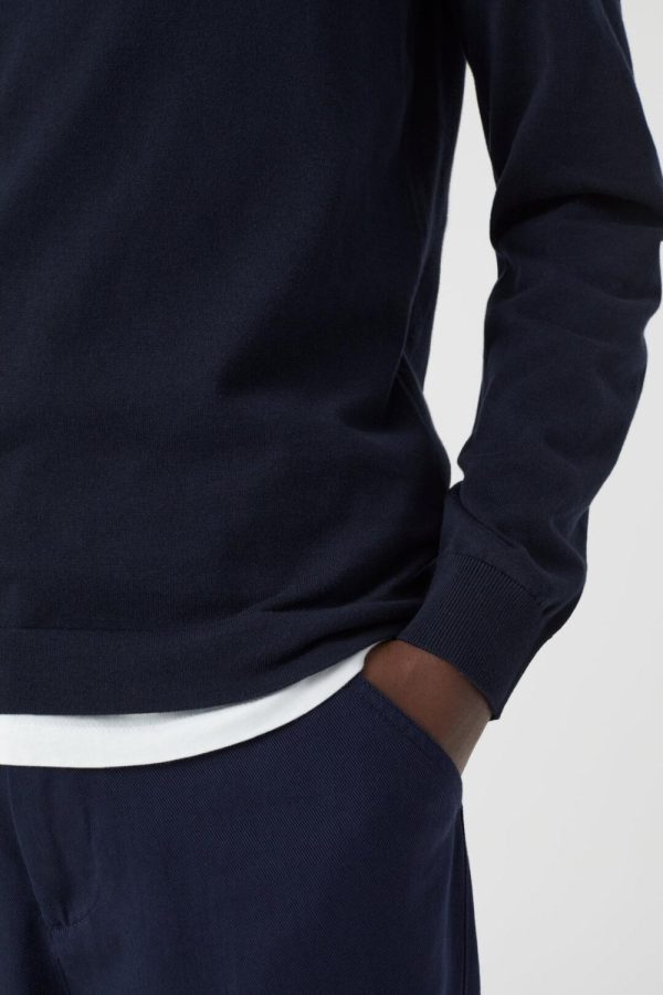 Rundhalspullover aus reiner Baumwolle. Feinstrick mit Bündchen am Ärmelabschluss. Am Saum mit glattem Bündchen gearbeitet.