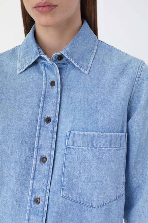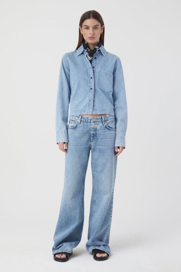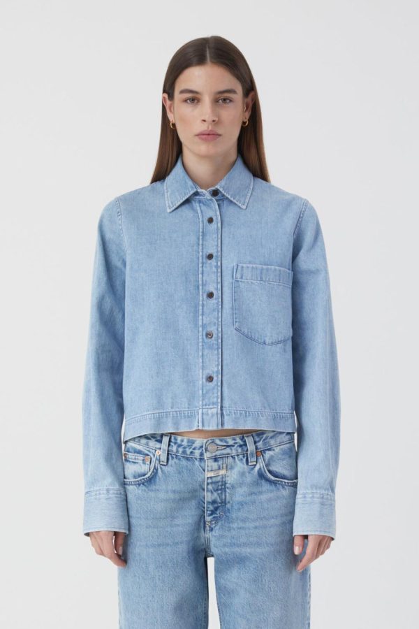 Gefertigt in Portugal, besteht unser cropped Denim Shirtaus reiner Bio-Baumwolle. Es hat einen superweichen Griff (8.5 oz.) und eine lebendige Struktur. Mit Hemdkragen, durchgehender Knopfleiste, einer Brusttasche und Manschetten.