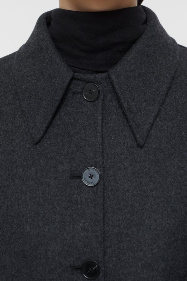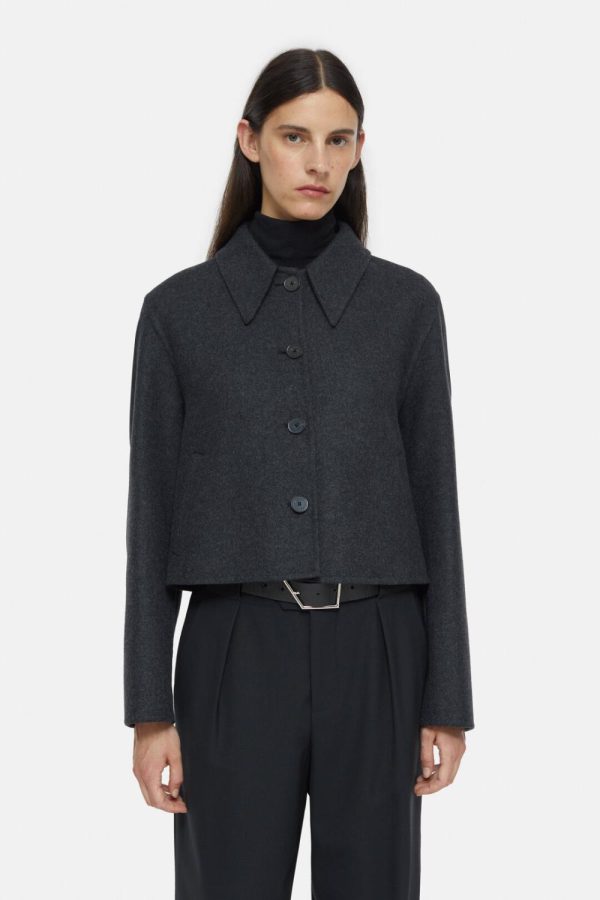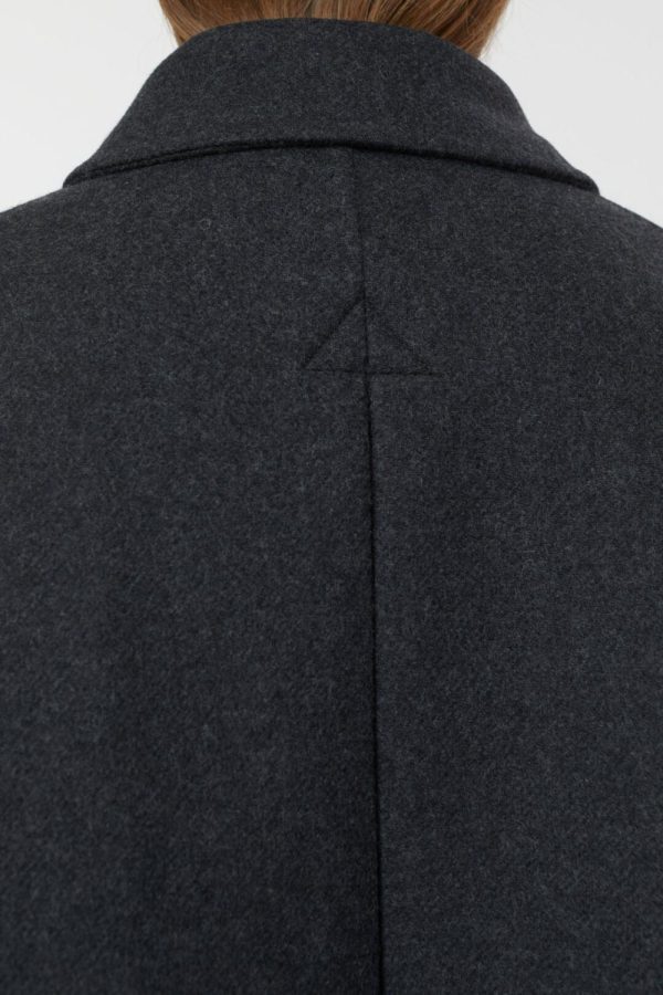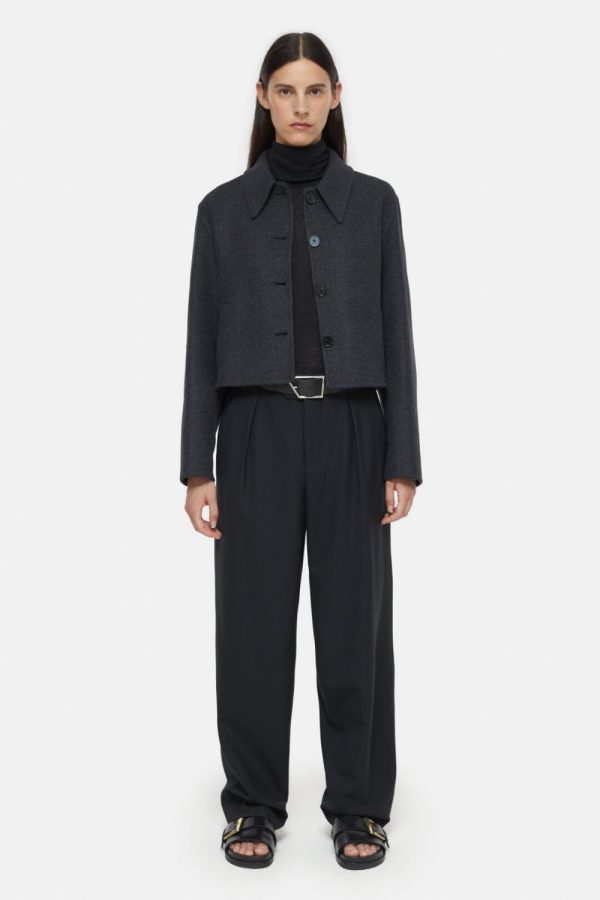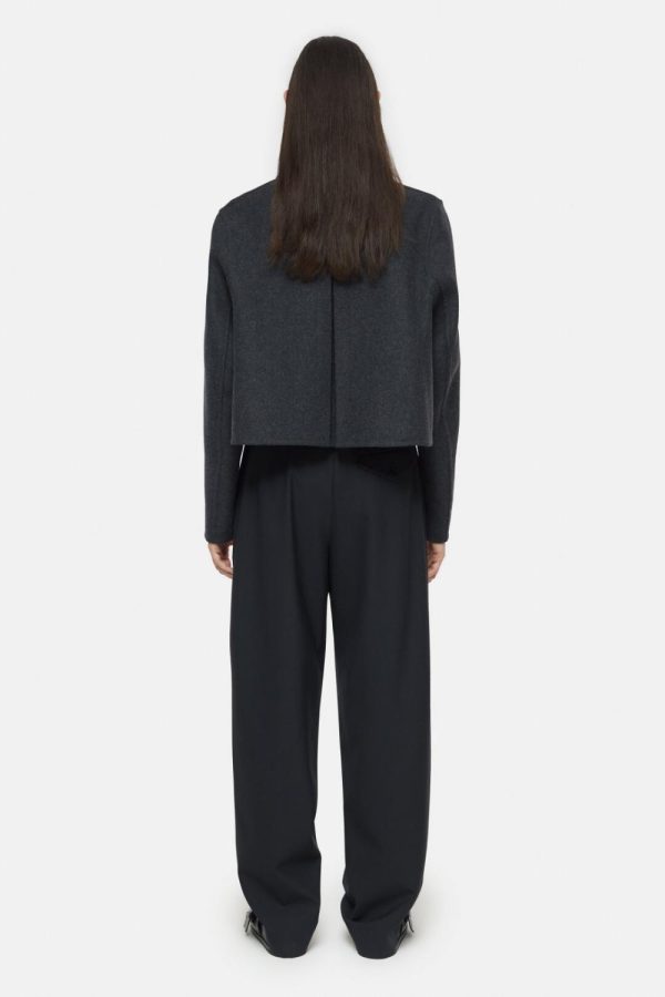 Die verkürzte Jacke wurde aus weichem italienischem Doubleface gefertigt und besteht zum Großteil aus recycelter Wolle. Die Verarbeitung des zweilagigen Stoffs benötigt viel Erfahrung, damit die Kleidungsstücke auch offen getragen gut aussehen. Zum Teil wurden die Kanten von Hand zusammengenäht. Die Jacke ist zu 100 Prozent made in Europe und mit Leistentaschen, Knöpfen in Horn-Optik sowie einer mittigen Kellerfalte auf der Rückseite ausgestattet.