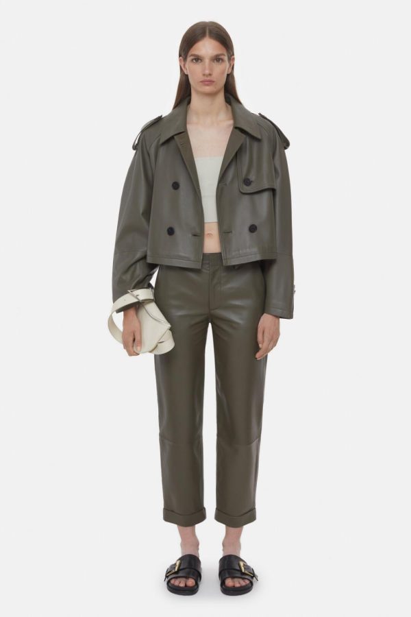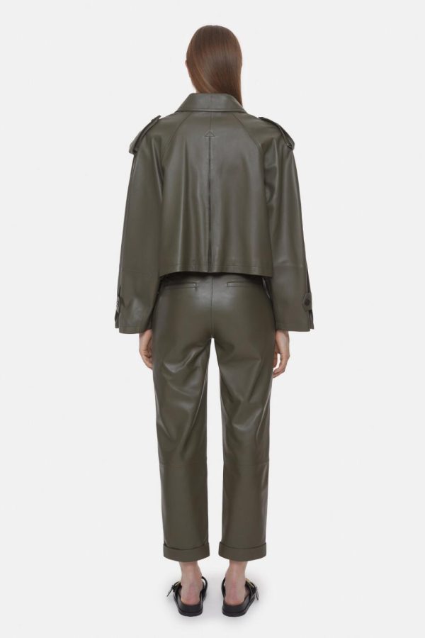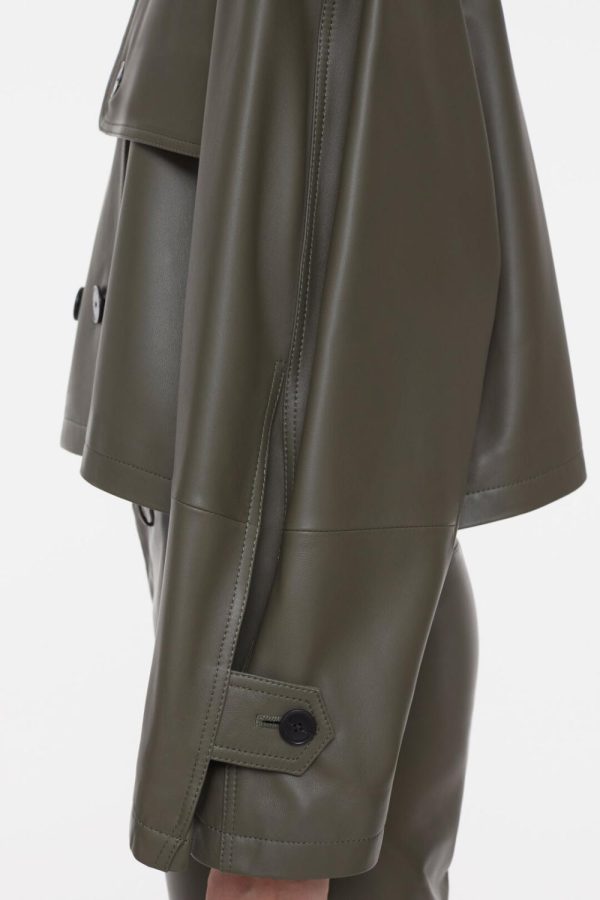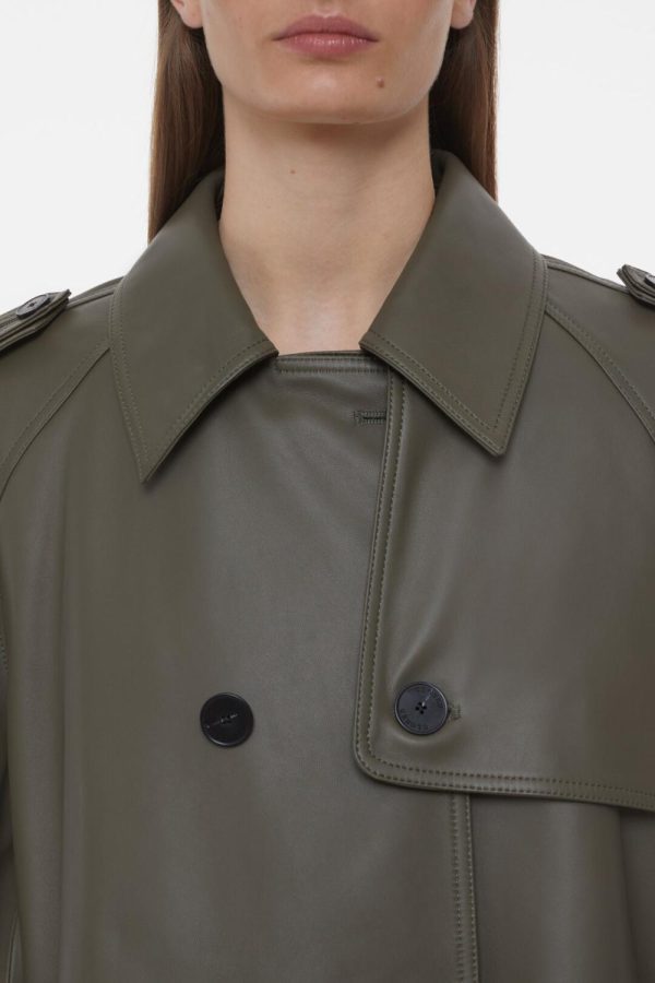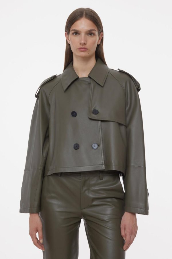 Die kurz geschnittene Trench-Jacke wurde aus weichem Leder in cleaner Optik gefertigt. Sie hat Raglanärmel mit Schulterriegeln, Knöpfe in Horn-Optik und ein Viskose-Futter. Die mittige Kellerfalte auf der Rückseite sorgt für eine leichte A-Form.