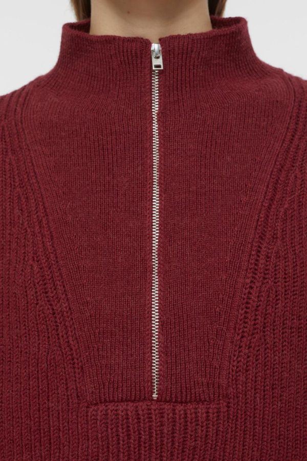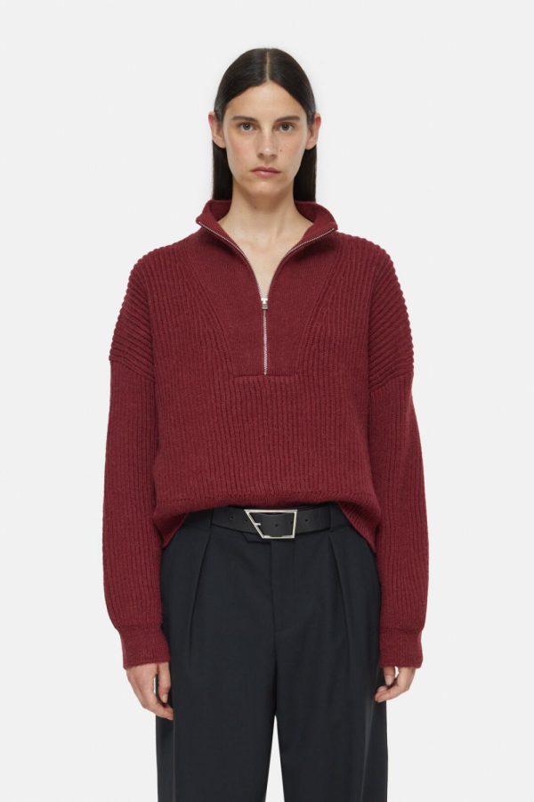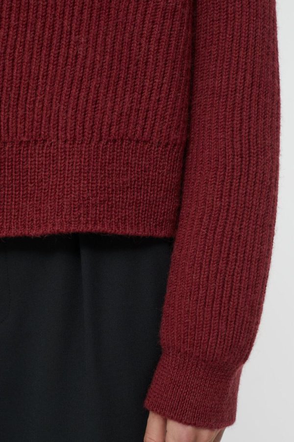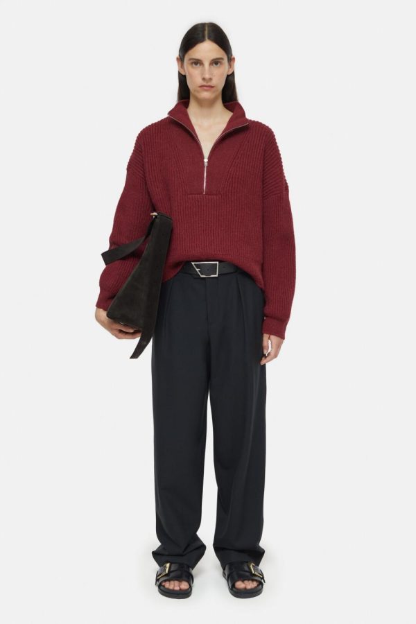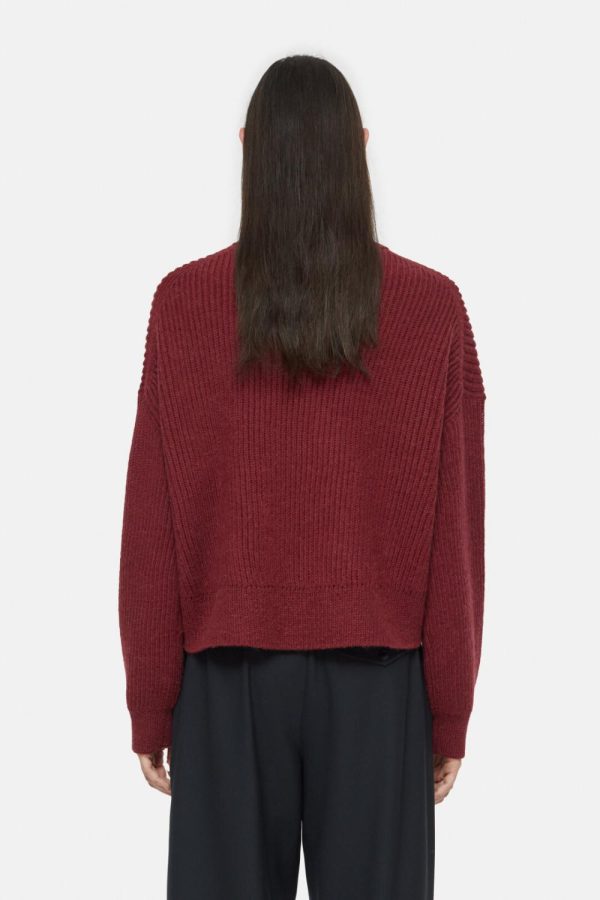 Aus italienischem Garn im Fisherman’s Rib – Mischung aus Alpakawolle und Schafswolle: Kurz geschnittener Troyer mit überschnittenen Schultern, Stehkragen, Metallreißverschluss und Rippbündchen. Mittelschwerer Strick (5 gg).