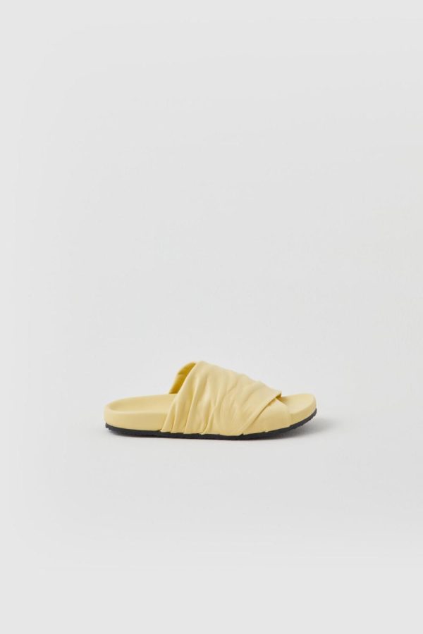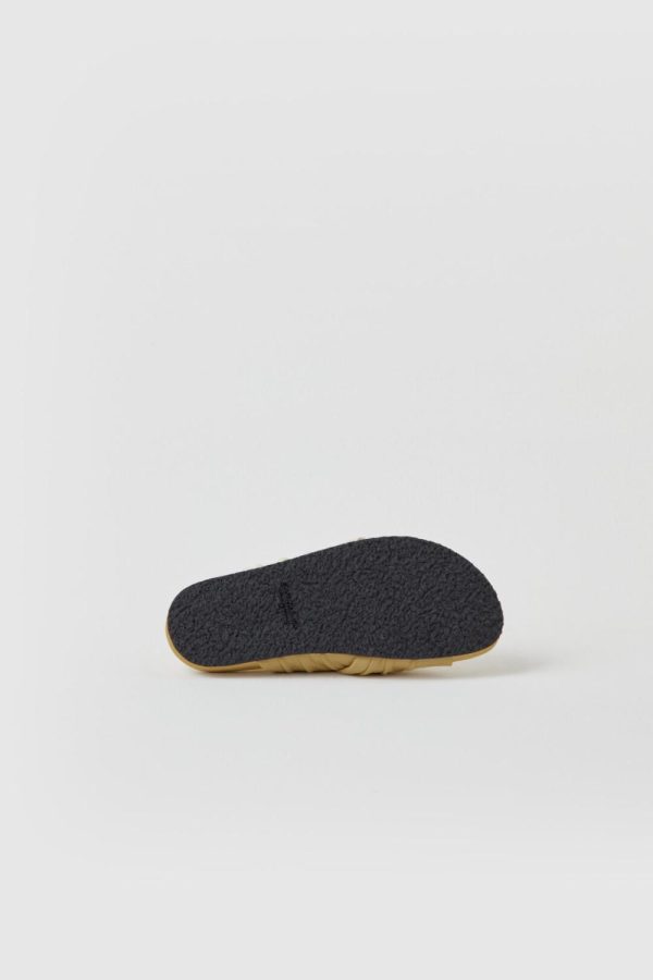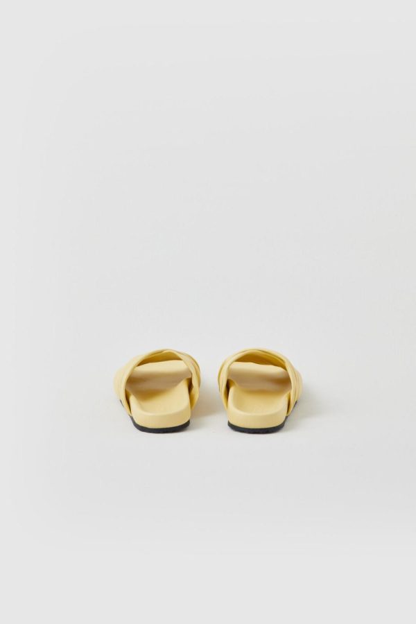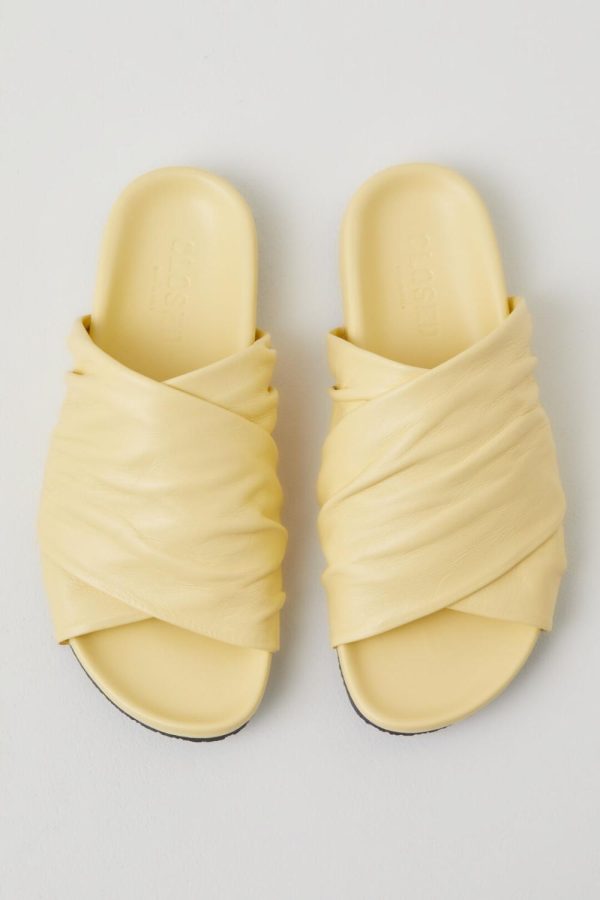 Pantolette mit breiten gekreuzten Riemen aus weichem italienischem Leder mit Fußbett und überzogener Innensohle. Laufsohle aus Gummi. Zu 100 Prozent in Italien gefertigt.