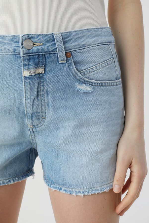 Teil unserer nachhaltigen Denim-Linie A BETTER BLUE: Hot Pants aus italienischem Non-Stretch-Denim von Candiani mit heller Waschung und Destroyed-Effekten. Im 5-Pocket-Style mit kupferfarbenen Nieten und veganem Patch aus Jacron.
