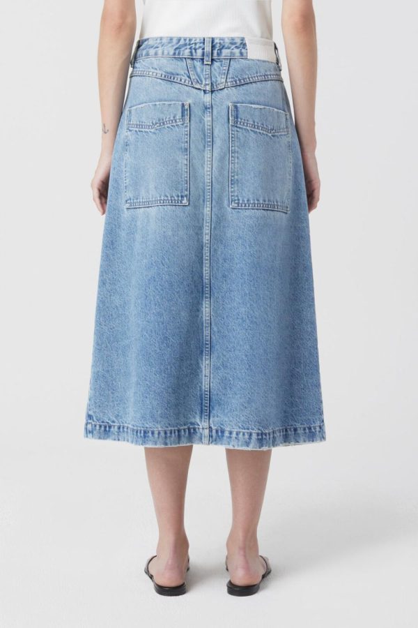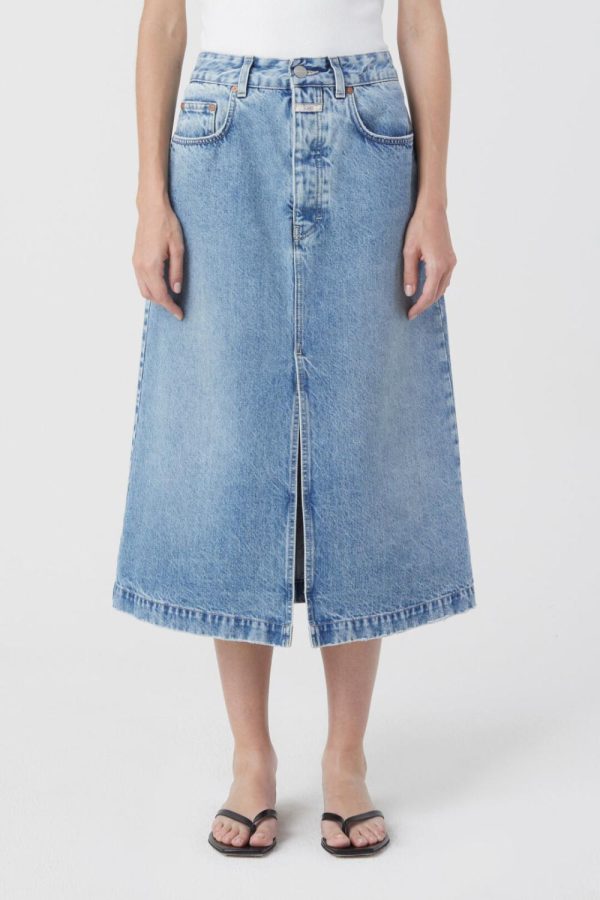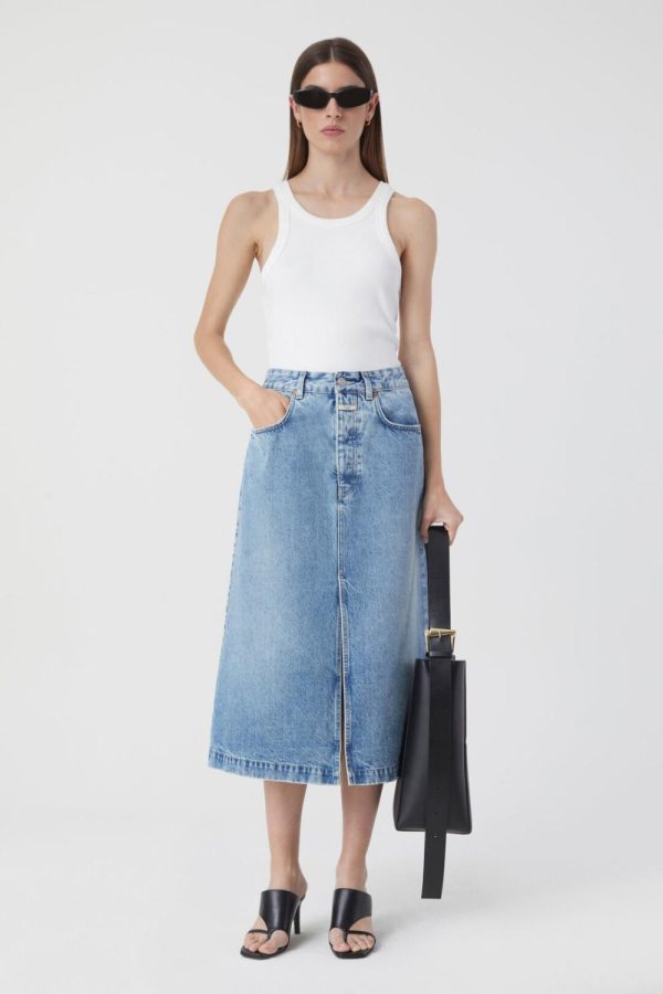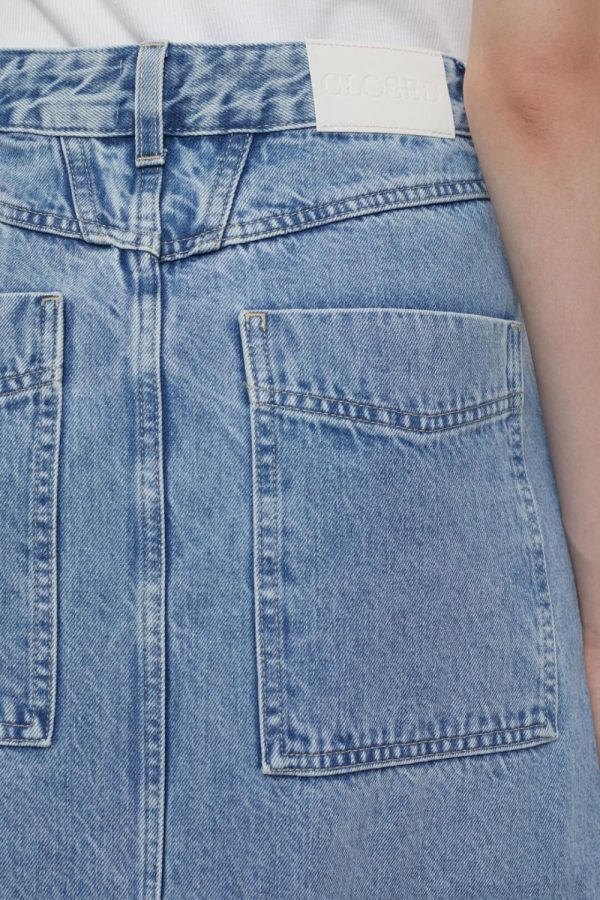 Teil unserer Eco-Denim-Linie A BETTER BLUE, die nachhaltige Materialien mit innovativen Wasch- und Färbemethoden kombiniert: Low Waist Denim Skirt mit mittigem Schlitz. Gefertigt in Italien aus kräftigem Denim (13 oz.) mit einem hohen Anteil an Baumwolle, die aus regenerativer Landwirtschaft stammt.