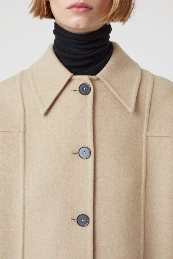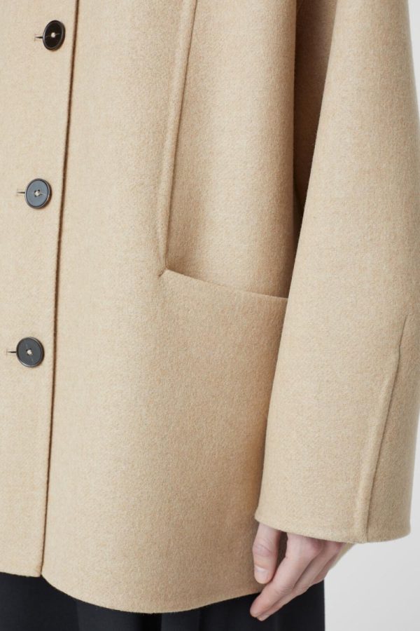 Der kurz geschnittene Mantel wurde aus weichem italienischem Doubleface gefertigt. Die Verarbeitung des zweilagigen Stoffs benötigt viel Erfahrung, damit die Kleidungsstücke auch offen getragen gut aussehen. Die Kanten wurden zum Teil von Hand zusammengenäht. Der Mantel ist einreihig, hat große Taschen und Knöpfe in Horn-Optik.
