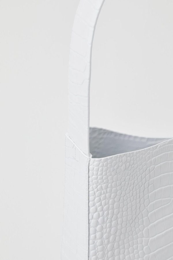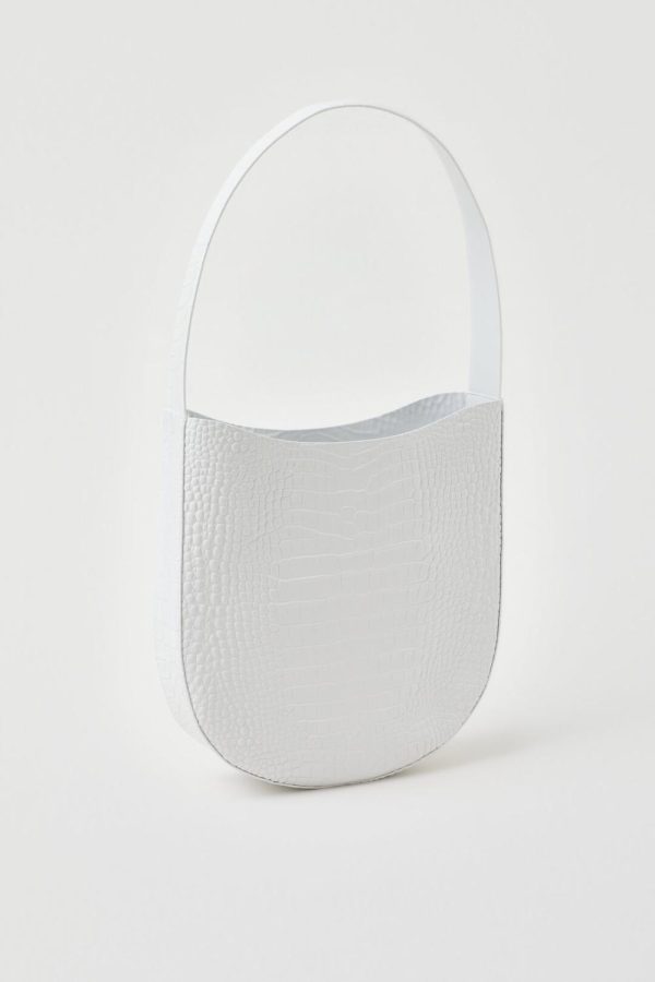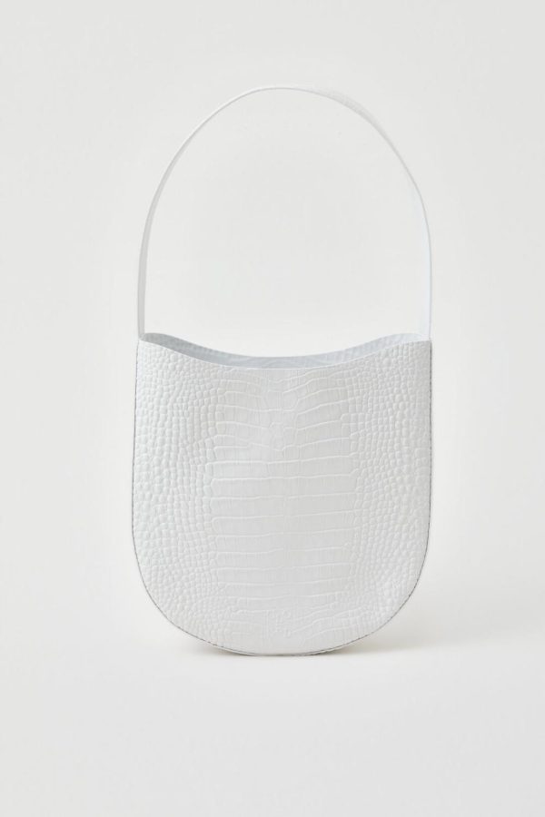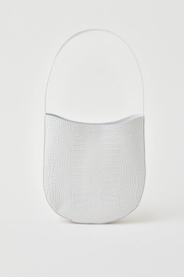 Mit Kroko-Prägung und Monogramm auf semi-glänzendem Leder: Unsere Half Round Bag mit breitem Riemen. Gefertigt aus großen Lederzuschnitten mit mehrfach handgefärbten und polierten Kanten. Kann per Druckknopf verschlossen werden und hat ein Steckfach innen.