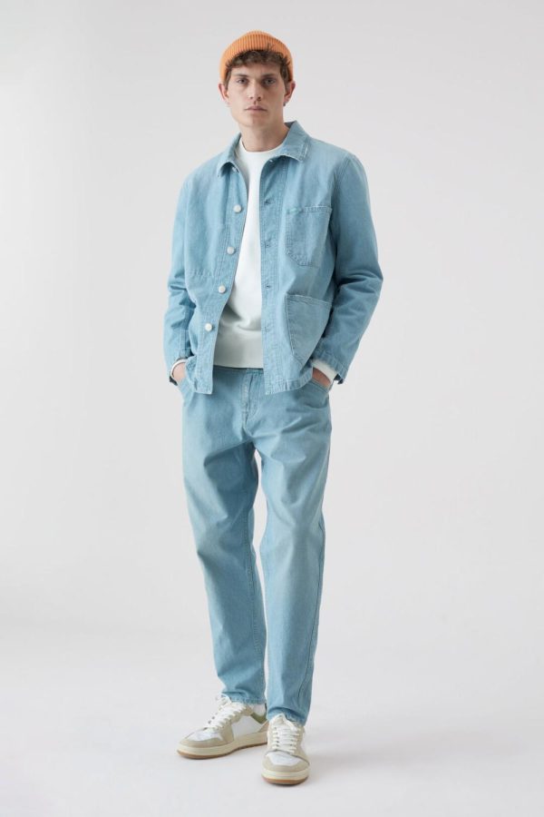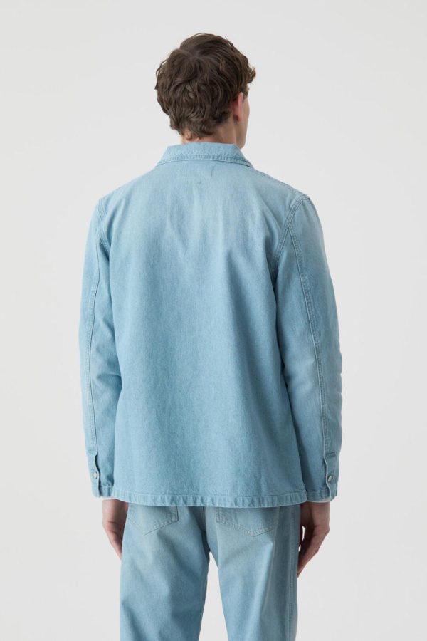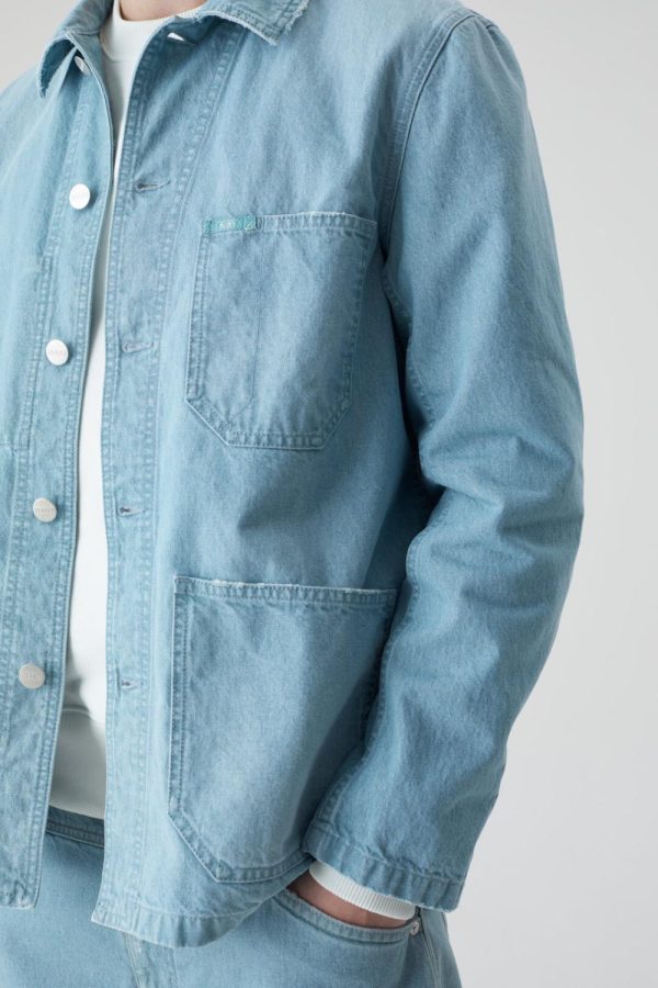 Worker Jacket aus leichtem spanischem Denim mit dezentem Grünschimmer – gewebt aus konventioneller Baumwolle, recycelter Baumwolle und recyceltem Polyester. Helle Waschung mit Used-Effekten an den Kanten sowie aufgesetzten Taschen, Innentasche und Metallknöpfen. Teil unserer nachhaltigen Denim-Linie A BETTER BLUE.
