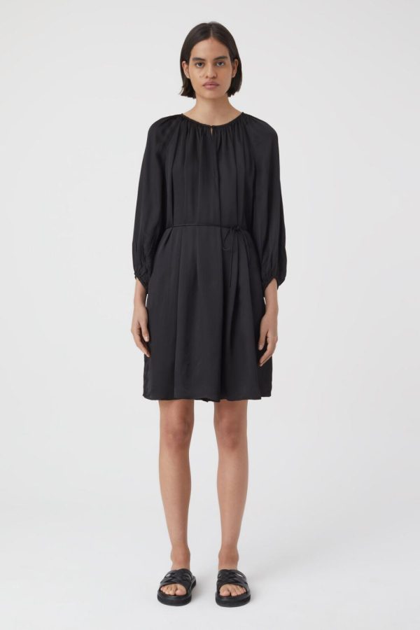 Hergestellt aus leicht fließender, gehämmerter Viskose: Kleid im Regular Fit mit Rundhalsausschnitt und langen Ärmeln mit Raffungen. Mit seitlichen Eingrifftaschen, Bindegürtel und geradem Saumabschluss.
