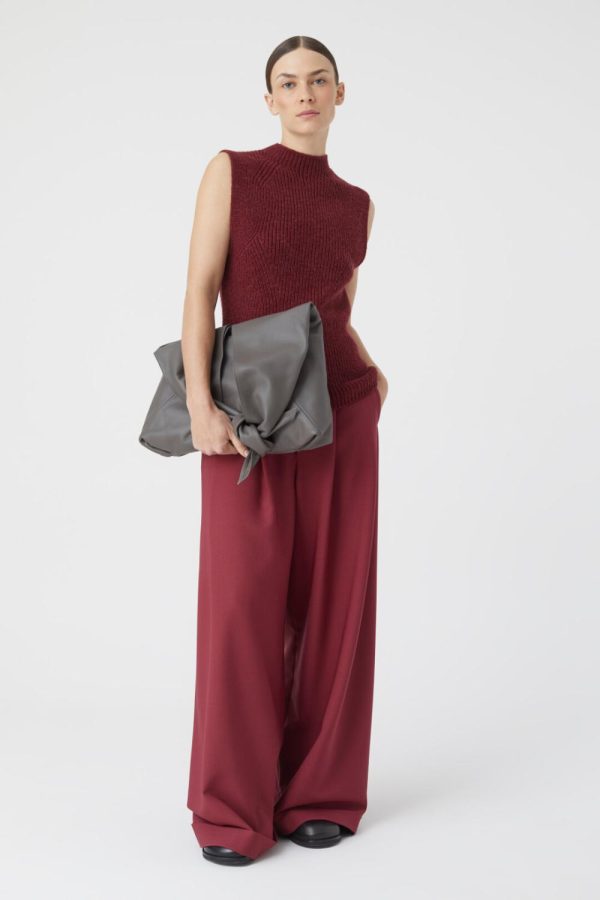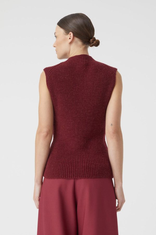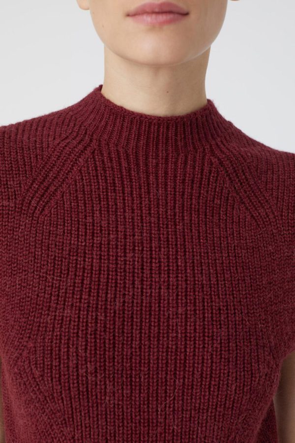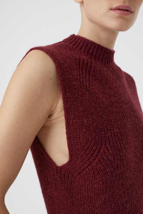 Der Pullunder mit Stehkragen im Fisherman’s Rib wurde aus italienischem Garn mit Alpaka-Anteil gestrickt. Es ist enganliegend geschnitten und hat einen Stehkragen. An den Seiten befindet sich jeweils ein Schlitz. Mittelschwerer Strick (5 gg).