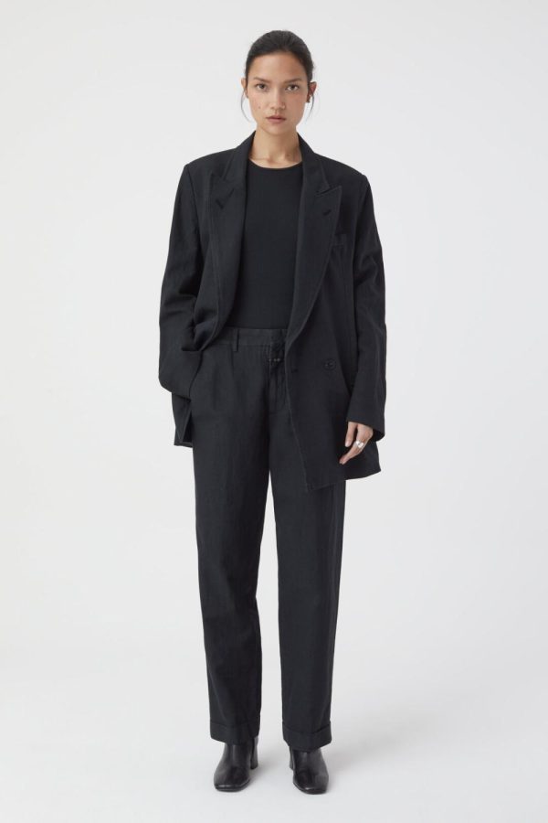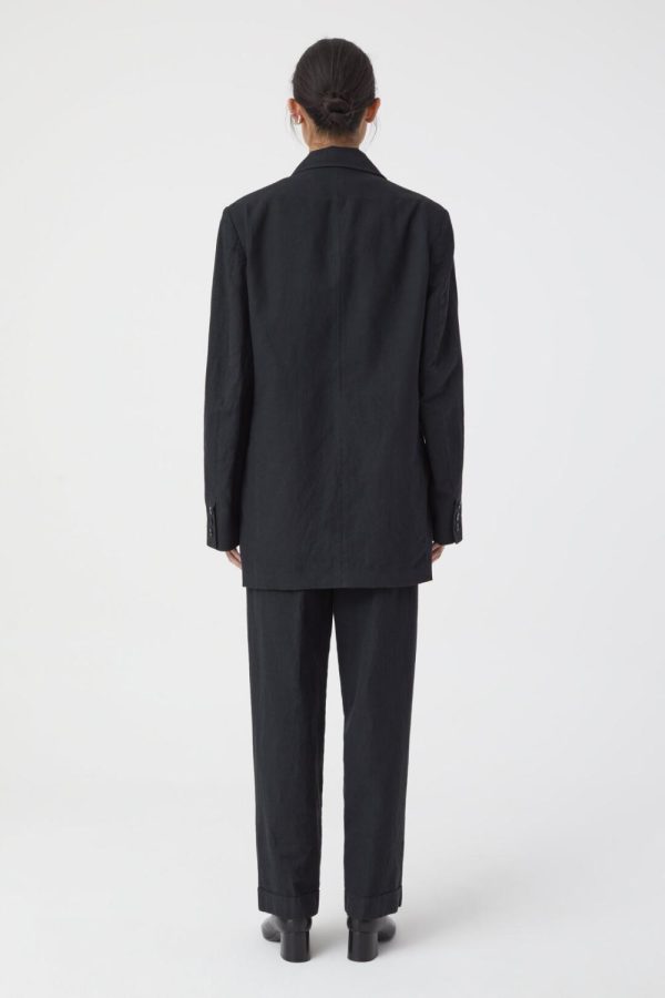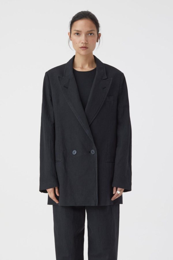 Aus leichtem italienischem Leinen-Baumwolle-Mix mit lebendiger Struktur, trockener Haptik und Garment-dye-Finish – zugeschnitten und konfektioniert bei Texdata: Relaxed Blazer mit steigendem Revers, seitlich versetzter Knopfschließe und paspelierten Taschen. Gefütterte Verarbeitung mit geknöpfter Innentasche.