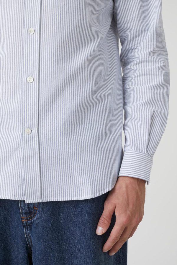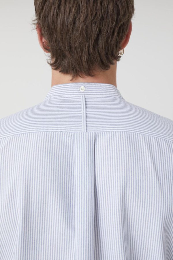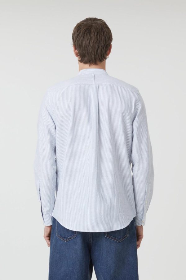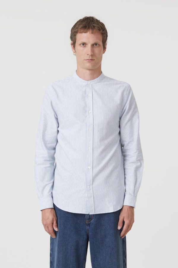 Hergestellt in Portugal, zeichnet sich unser Stehkragenhemd aus Baumwolle durch sein garngefärbtes Streifenmuster aus. Mit Perlmuttknöpfen und Manschetten an den Ärmelabschlüssen.