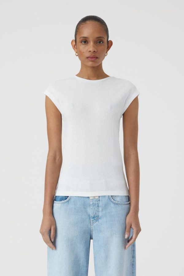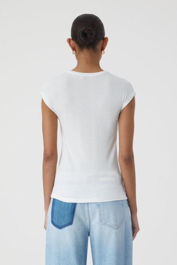 T-Shirt im Slim Fit, hergestellt aus feinem Baumwollgarn mit recyceltem Polyester. Unregelmäßiger Rippstrick mit Rundhalsausschnitt und sehr kurzen Ärmeln.