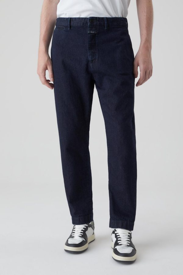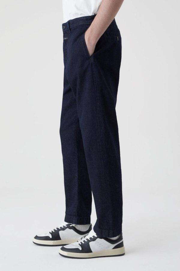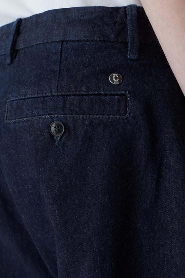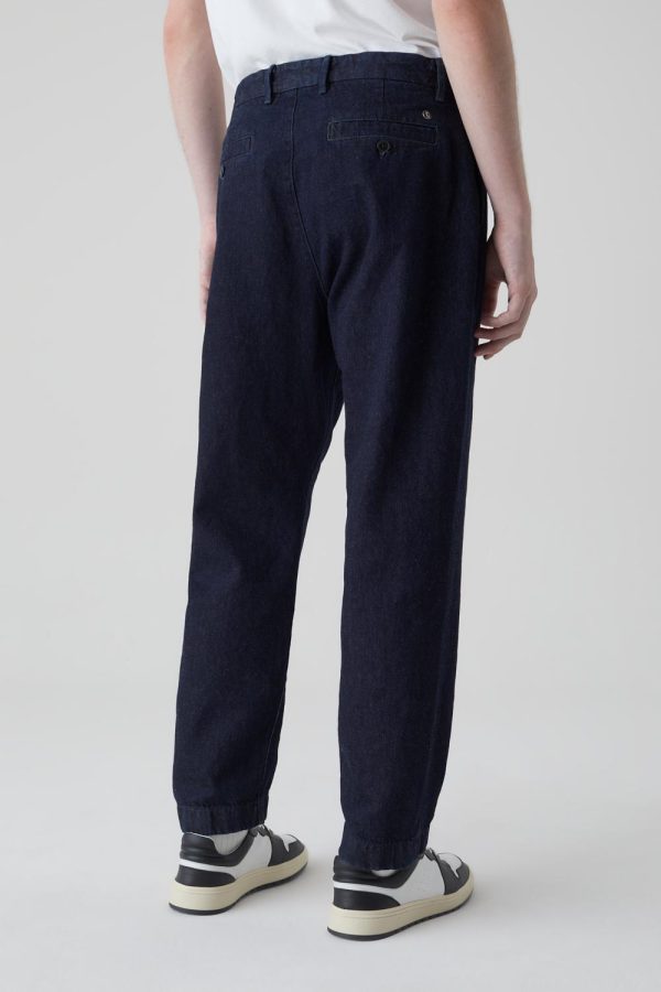 – Looks like: Denim mit dezenten Unregelmäßigkeiten (Naps) in tiefem Indigo mit cleaner Waschung, tonigen Nähten und Details