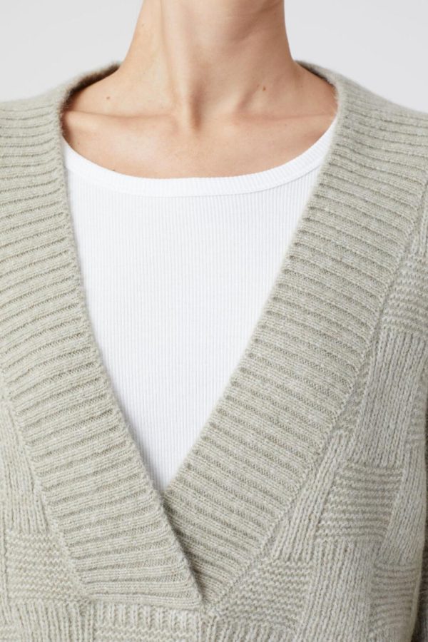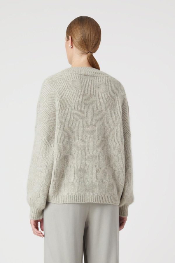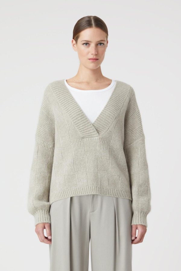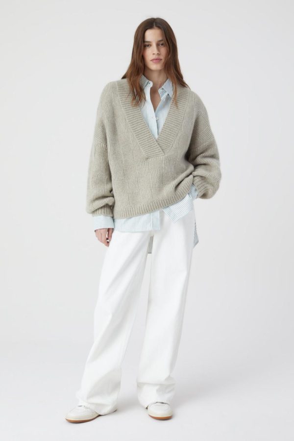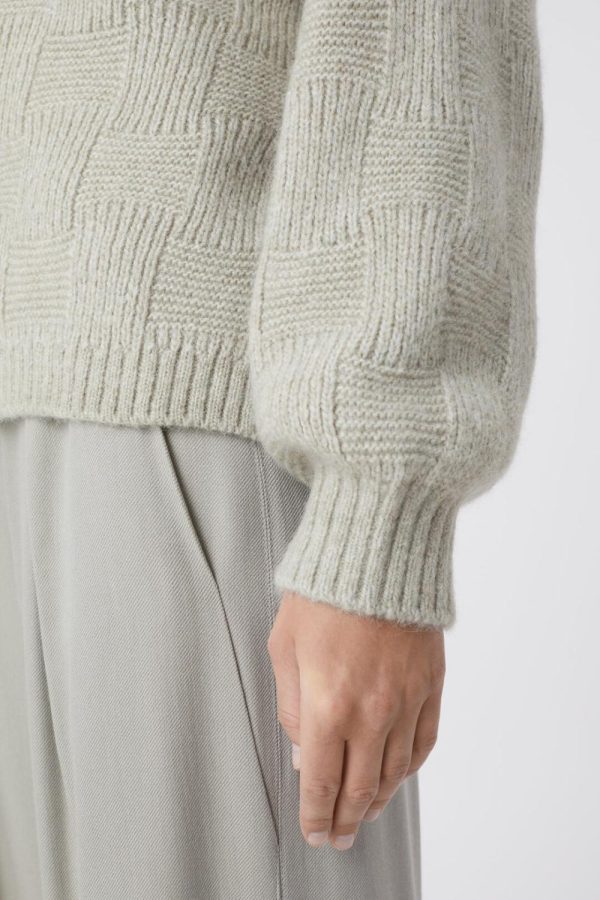 V-Pullover mit Schachbrettmuster aus unterschiedlich gestricktem Alpaka-Mix-Garn – gesponnen im italienischen Traditionsbetrieb Pecci Filati. Boxy Fit mit breitem Bündchen am V-Ausschnitt.